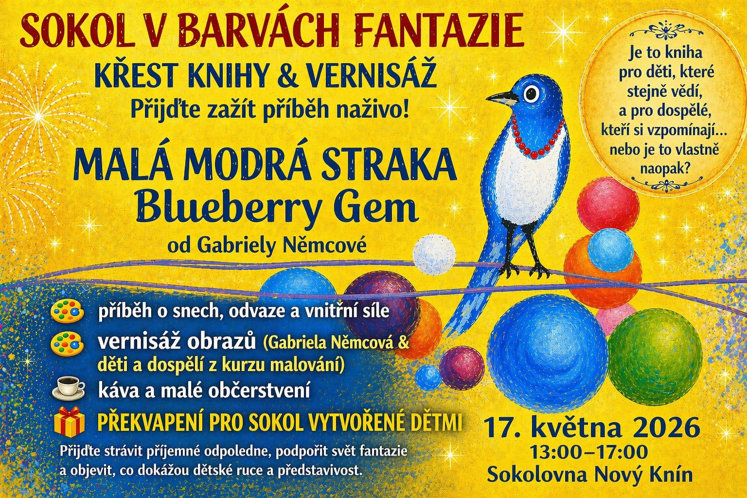 MALÁ MODRÁ STRAKA – PRODEJ KNIHY A VERNISÁŽ OBRAZŮ – 17.5.2026 – OD 13 HOD. – SOKOLOVNA NOVÝ KNÍN