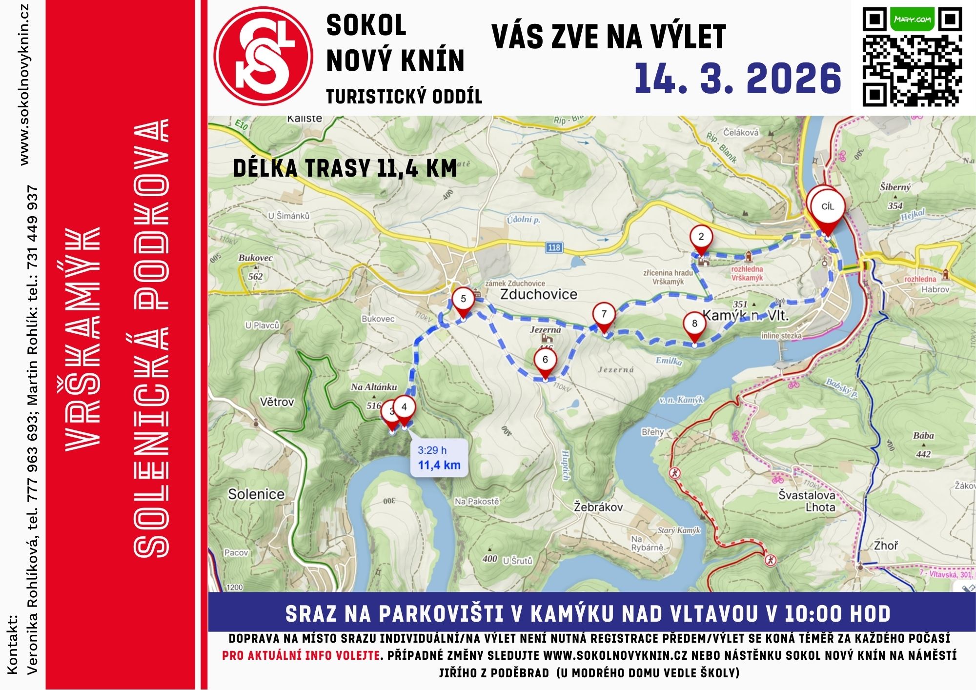 Datum 14. března 2026 Už proběhla Čas 8:00 – 18:00 VÝLET TURISTICKÉHO ODDÍLU – VRŠKAMÝK – SOLENICKÁ PODKOVA – 14.3.2026 – SRAZ KAMÝK NAD VLTAVOU V 10 HOD. Sdílet tuto událost + Přidat do Google kalendáře + iCal / Outlook export Událost je ukončena.